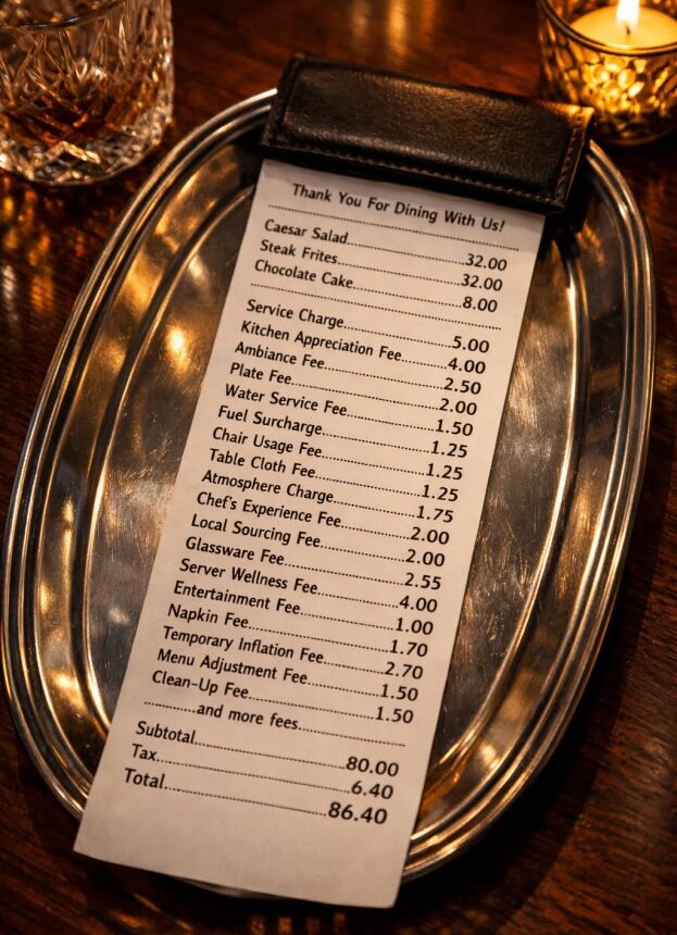It started with hotels and their infamous “Resort Fees” (paying $45 extra for the privilege of using the pool you already thought you paid for). But now, it has infected your dinner.
